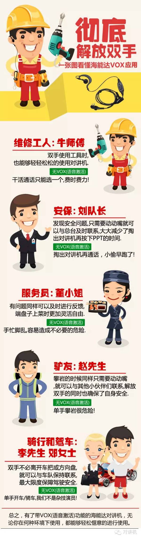 由于部分用户特殊的工作需要(如工程维修人员),在日常工作中,很多时候不能释放双手操作对讲机的PTT键进行通话,所以在有的对讲机上就有vox功能,但是如何理解和使用呢?